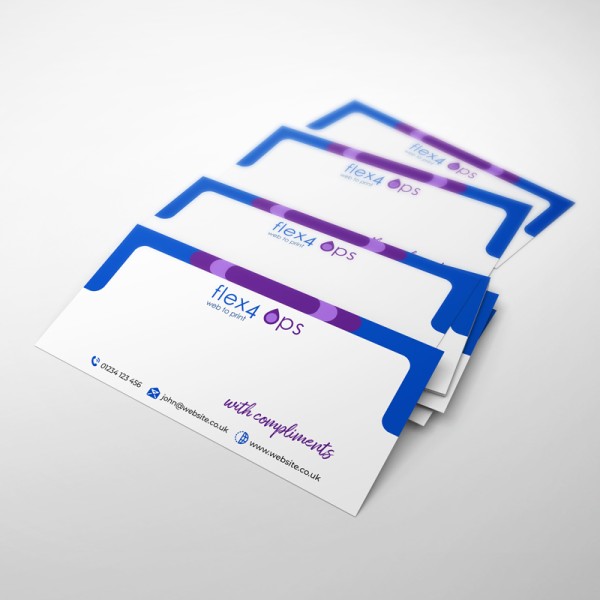 Print your custom compliment slip designs with Flex4. Add a new level of professionalism to your business with highly quality compliment slips - minimum print quantity of 500.